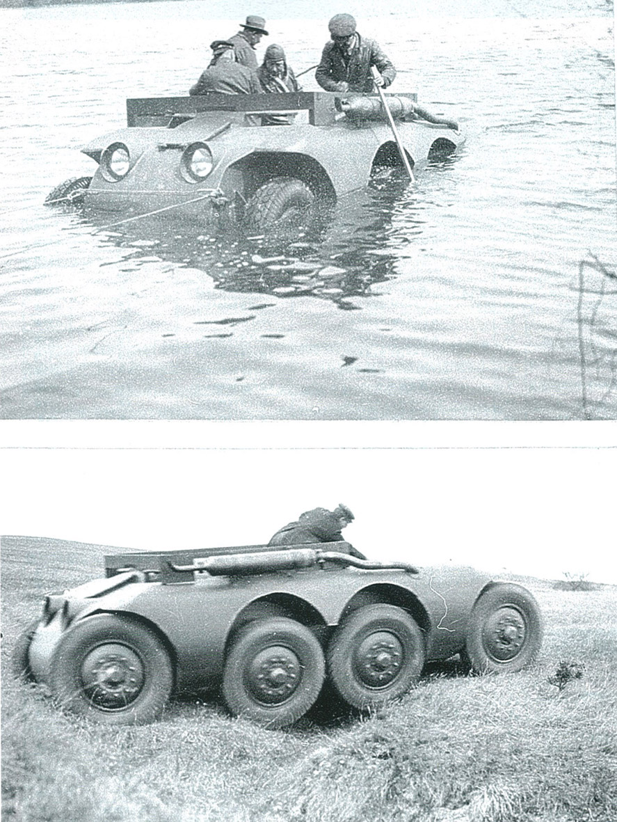 ワイマール共和国の兵器局による偵察用装甲車の課題に、まだダイムラーベンツにいたポルシェ博士が応えた物だそうです。前進後進ともに64km/hで走れて、体勢の切り替えが10秒以内に出来る事、33%の勾配に対応し、1.5mの溝から外力無しに抜けだせて、水深91センチでも動ける事。
